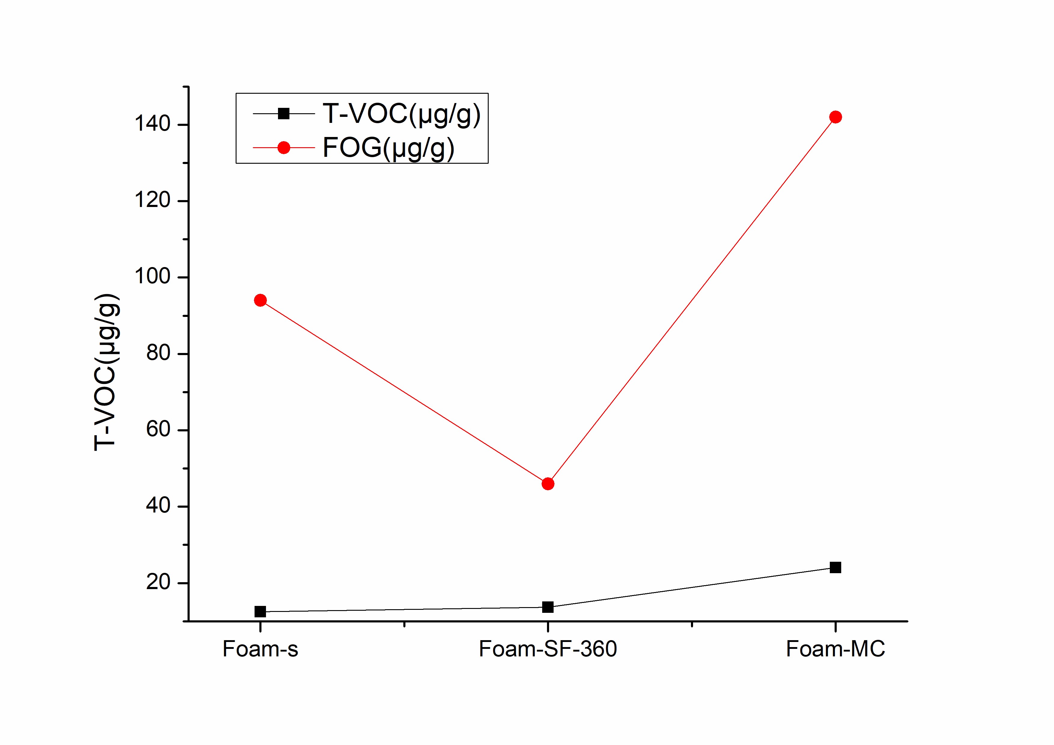- 对不同柔软剂制备的泡沫,24小时后,测试泡沫T-VOC和FOG的结果,发现二氯甲烷制备的泡沫T-VOC远高于新型环保型柔软剂SF-360制备的泡沫T-VOC;而FOG数值显示,柔软剂360具有明显的优势。