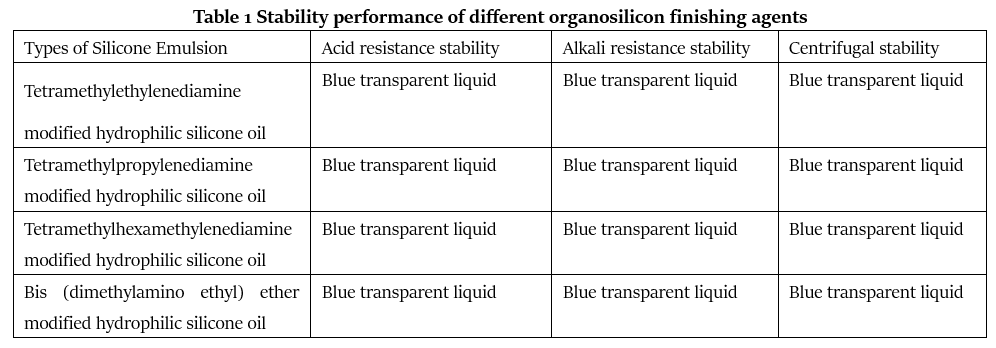 The stability status of different organosilicon finishing agents is shown in Table 1.