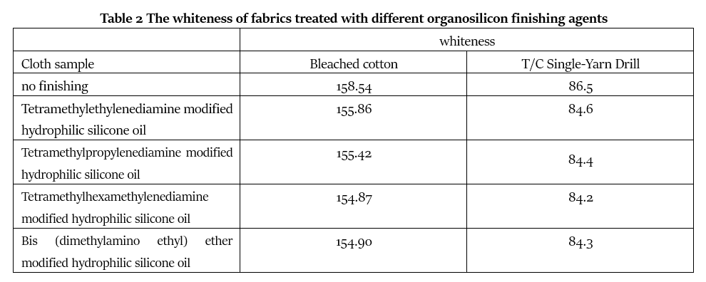It can be seen from Table 2 that the whiteness of the finished fabric is lower than that of the unfinished blank fabric to a certain extent. The four tertiary amine-modified hydrophilic silicone oils have similar effects on the whiteness of the fabric. This is because their structures are relatively similar. They are all modified with the main chain quaternary ammonium salt block structure and have strong antioxidant capacity. The finished fabric has strong resistance to yellowing, and the whiteness decline is small. Tetramethylethylenediamine modified hydrophilic silicone oil and tetramethylpropylenediamine modified hydrophilic silicone oil have slightly less influence on the whiteness of fabrics. Tetramethylethylenediamine modified hydrophilic silicone oil and bis(dimethylamino) Ethyl ether modified hydrophilic silicone oil has a slightly greater impact on the whiteness of fabrics.