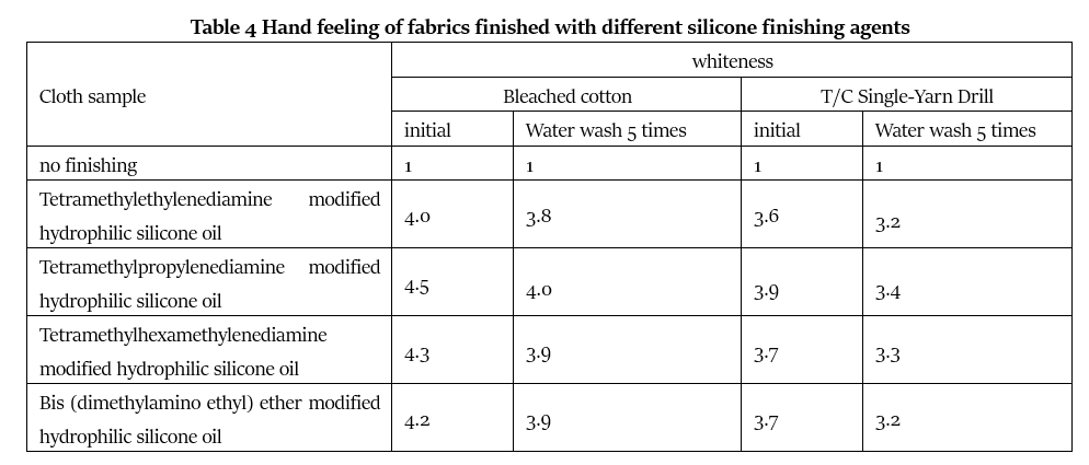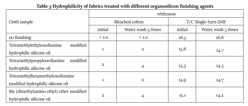 It can be seen from Table 3 that the hydrophilicity of bleached cotton fabrics and polyester-cotton yarns after treatment with silicone finishing agents is reduced to varying degrees compared with untreated fabrics. Among them, the tetramethylethylenediamine modified hydrophilic silicone oil and the tetramethylhexamethylenediamine modified hydrophilic silicone oil have slightly less influence on the hydrophilicity of the fabric, and the tetramethylethylenediamine modified hydrophilic silicone oil has a little (Methylaminoethyl) ether modified hydrophilic silicone oil has a slightly greater impact on the hydrophilicity of the fabric, but the degree of impact is roughly the same, and the hydrophilicity is faster. This is related to the large number of cationic quaternary ammonium salt groups in its structure. This group has very excellent hydrophilic properties, and at the same time its ability to bind to fibers is also strong, so it has good washing resistance.