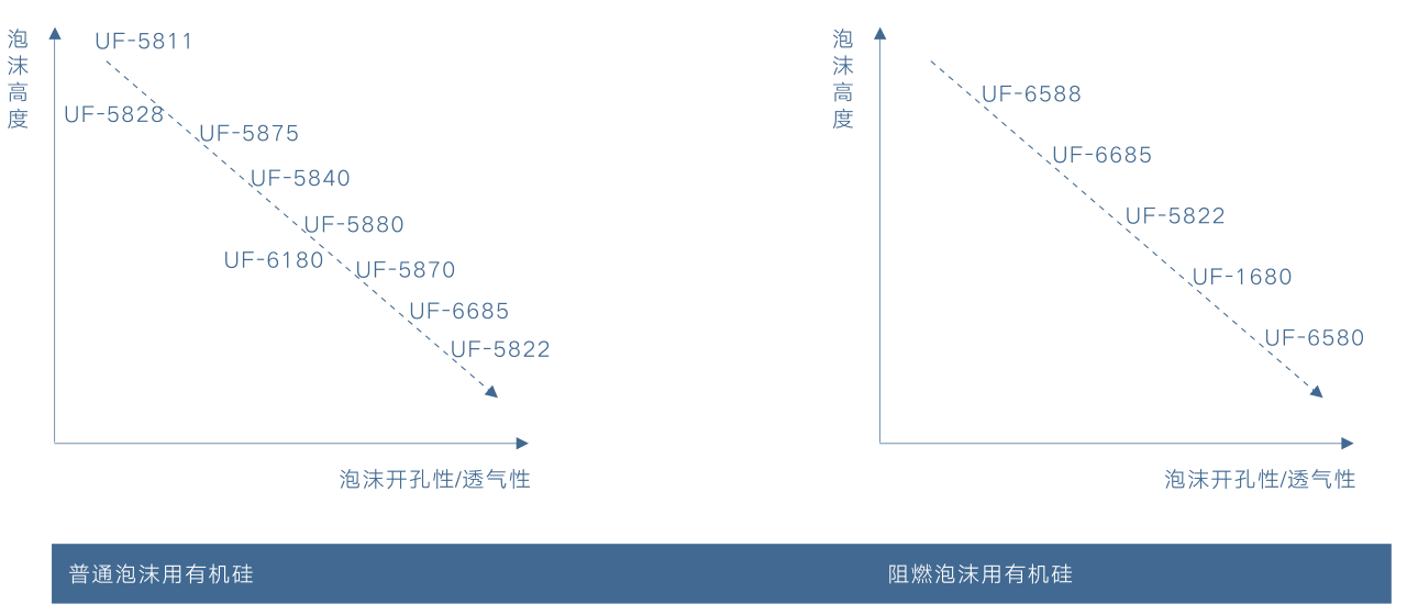 | UF-5880 | ● | 中高 | ● | ● | 软质泡沫通用性硅油,较有益的工艺操作宽容度,适用于不同种类的连续发泡设备和一般的箱式发泡 | ||