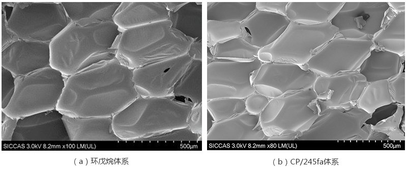 图2是UR-5988在CP、CP/245fa两种体系中发泡得到的扫描电镜图,从图中可以看出,泡孔尺寸都比较均一,说明得到的泡沫的泡孔比较细腻。