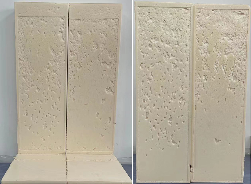 通过在L模中发泡,将泡沫表皮去掉0.5-1.5 cm,观察泡沫表面缺陷。由UR-16916与B-8制备的泡沫表面缺陷如图2所示: